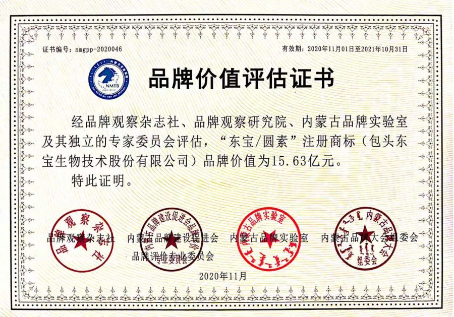 11月19日,由內(nèi)蒙古自治區(qū)工商聯(lián)、內(nèi)蒙古自治區(qū)發(fā)改委、內(nèi)蒙古自治區(qū)農(nóng)牧廳等單位指導(dǎo),巴彥淖爾市人民政府、內(nèi)蒙古品牌建設(shè)促進(jìn)會主辦,巴彥淖爾市工商聯(lián)、巴彥淖爾市綠色產(chǎn)業(yè)統(tǒng)籌發(fā)展辦公室、內(nèi)蒙古巴彥綠業(yè)實業(yè)有限公司承辦,以“聚合區(qū)域品牌優(yōu)勢,賦能河套品牌經(jīng)濟(jì)”為主題的第七屆內(nèi)蒙古品牌大會暨“天賦河套”區(qū)域公用品牌推介會在巴彥淖爾市隆重召開。東寶生物作為受邀參加企業(yè),在大會中榮獲多項大獎,東寶/圓素品牌價值更是再一次實現(xiàn)突破,升至15.63億元,較去年增加了5.86億元。